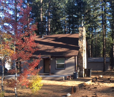 Two bedroom, one bath cabin and storage shed for rent. One bedroom is downstairs, one large bedroom is upstairs. Located on the edge of Sierra Tract in South Lake Tahoe, it backs onto Conservancy land and Forest Service lands. The interior is finished in knotty pine, with a themostatically controlled gas fireplace for heating, and with electric hot water. |